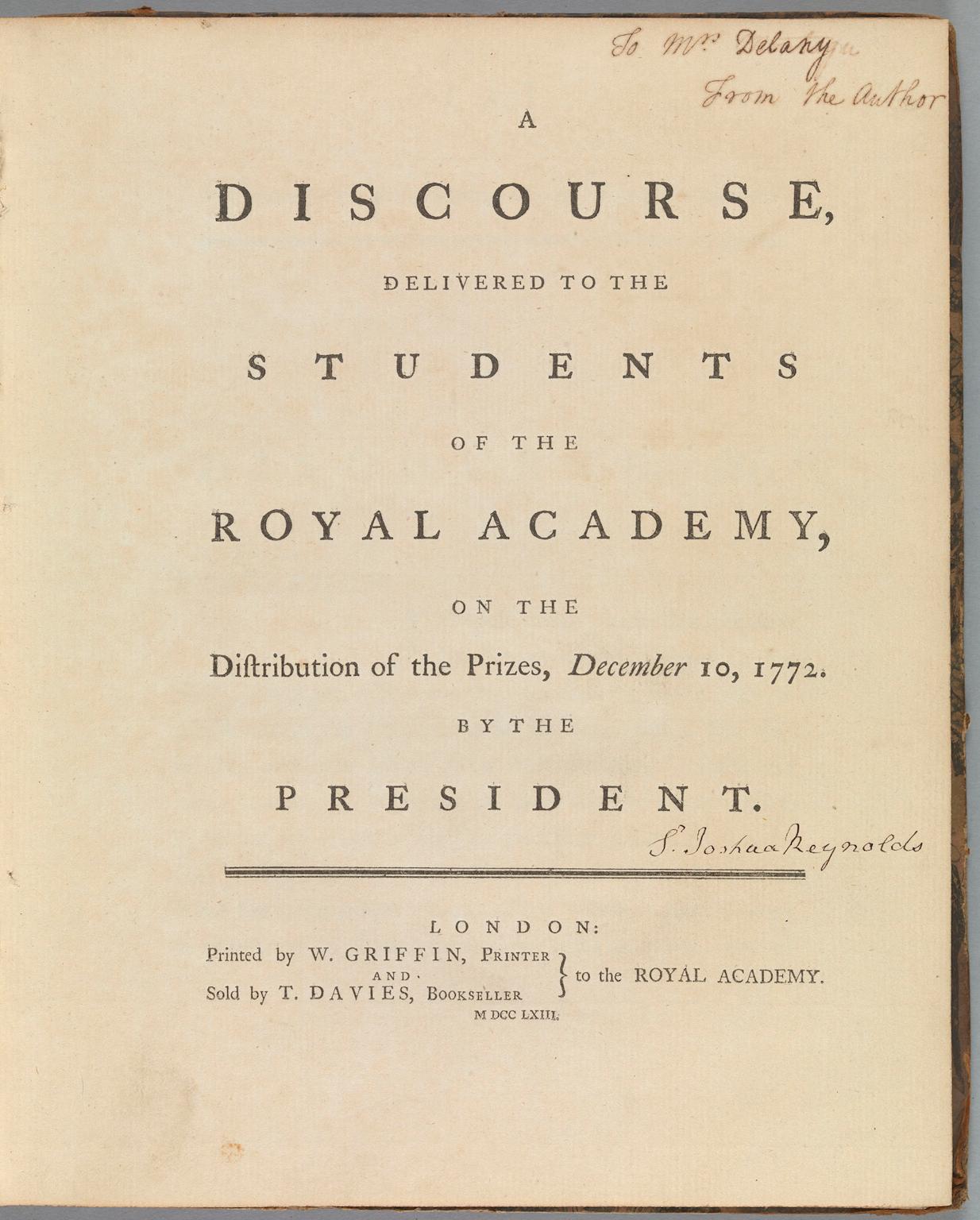 Sir Joshua Reynolds, the first President of the Royal Academy, delivered a series of lectures to students between 1769 and 1790. His Discourses on Art elevated art as an activity of the mind, not the hand, and called on painters to imbue their work with much more than simply what they saw in front of them.