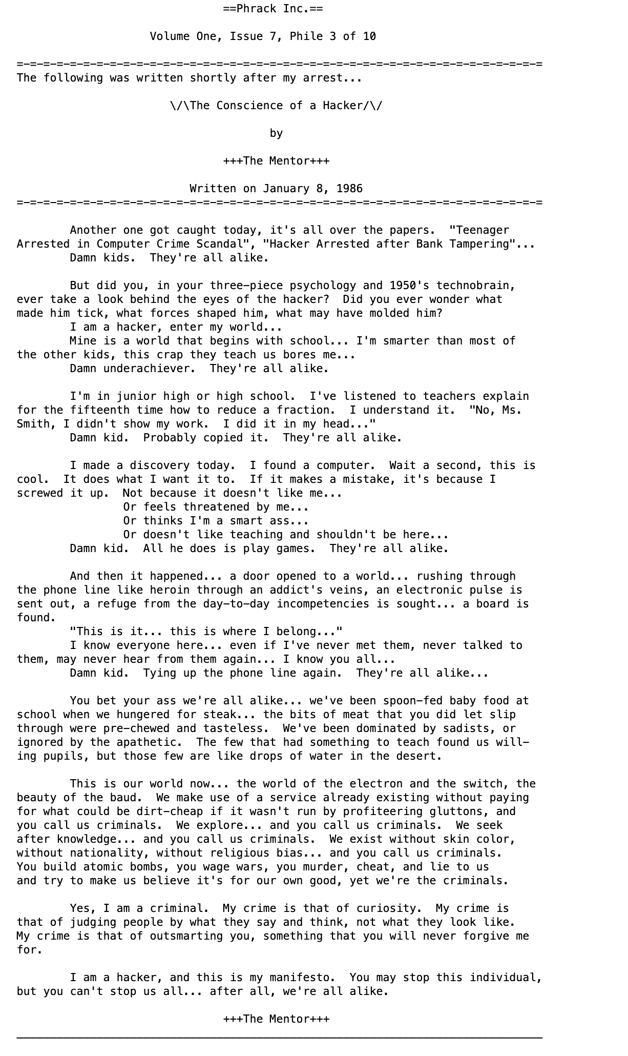 The Conscience of a Hacker (also known as The Hacker Manifesto) is a short essay written on March 18, 1986, by Loyd Blankenship, a computer security hacker who went by the handle The Mentor, and belonged to the second-generation hacker group Legion of Doom.